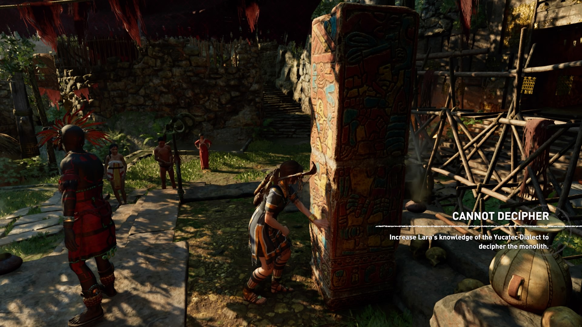 When you find a monolith in a square in Paititi written in Yucatec, the game doesn’t give an option for you to ask anyone around you to help translate it (instead you have to improve your knowledge by finding documents and murals), creating a very surreal scene.